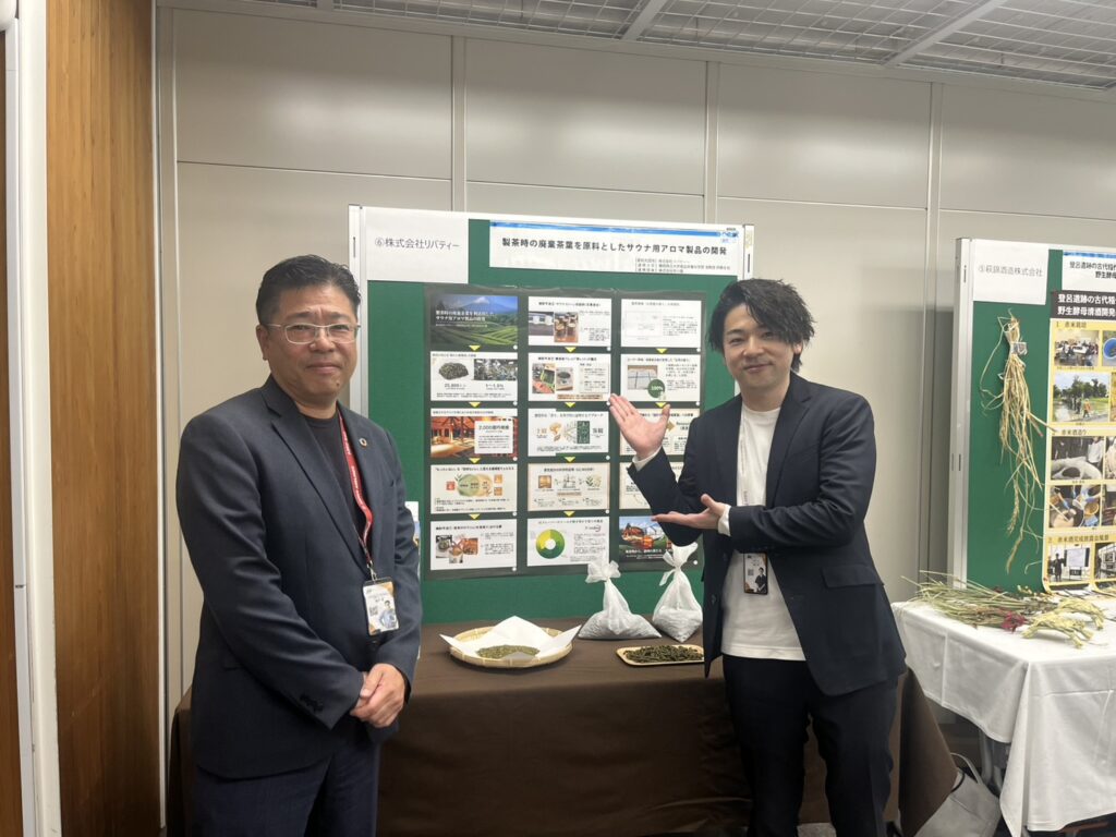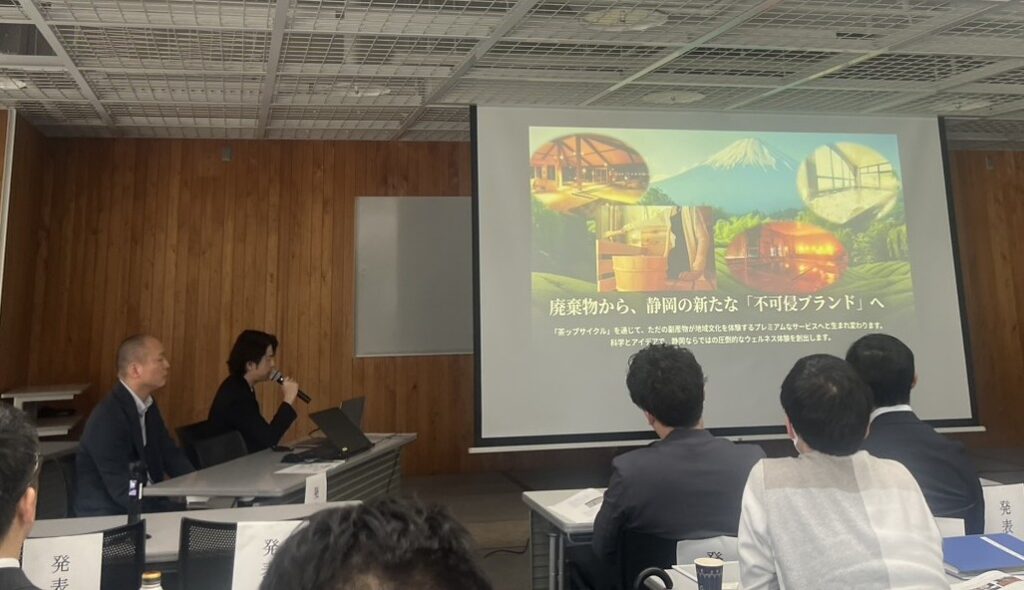 弊社は「⑥製茶時の廃棄茶葉を原料としたサウナ用アロマ製品の開発」をテーマに、成果発表を行いました。